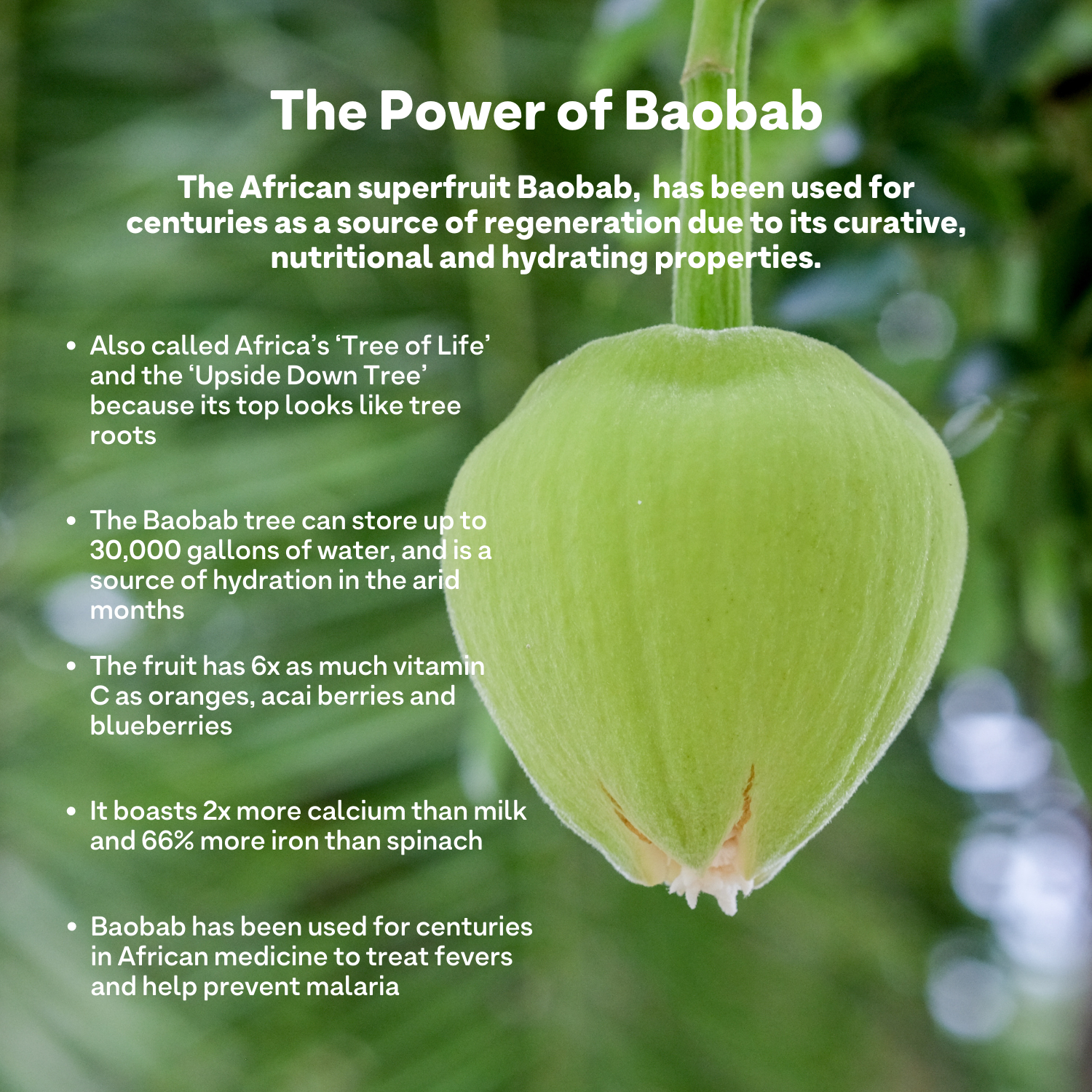 • Baobab: Rich in essential vitamins and minerals, it is known to moisturize, strengthen and fortify hair, helping to prevent breakage.