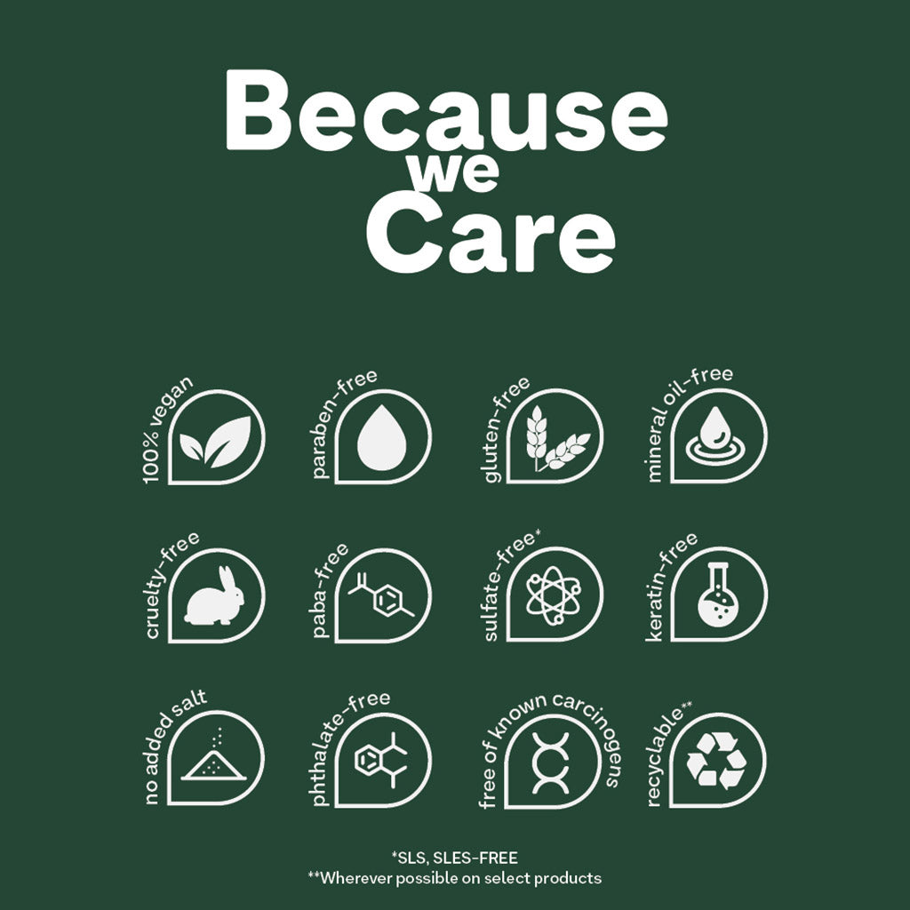 Sulfate-free* | No Added Salt | 100% Vegan | Cruelty-Free | Gluten-Free | Phthalate-Free | Paraben-Free | PABA-Free | Mineral Oil-Free | Keratin-Free